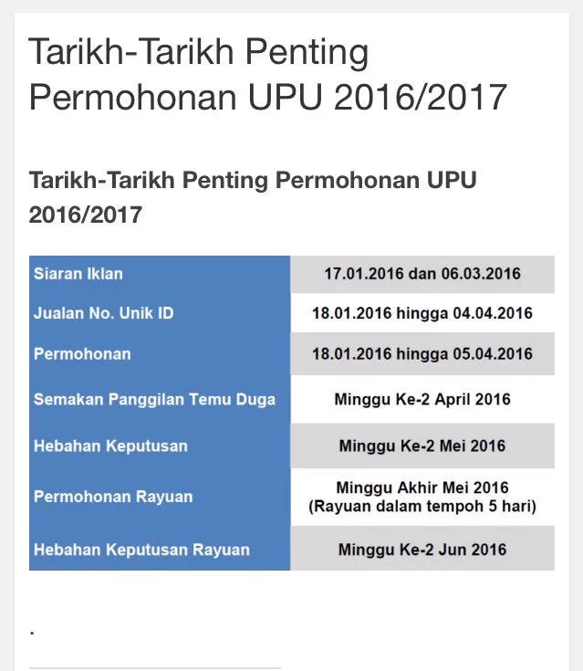 Minggu Akhir Mei 2016. Dalam kurungan adalah tarikh bagi tahun sebelumnya. Tarikh-Tarikh Penting Permohonan UPU 20162017 Siaran Iklan 17 Januari - 6 Mac 2016 Jualan No.